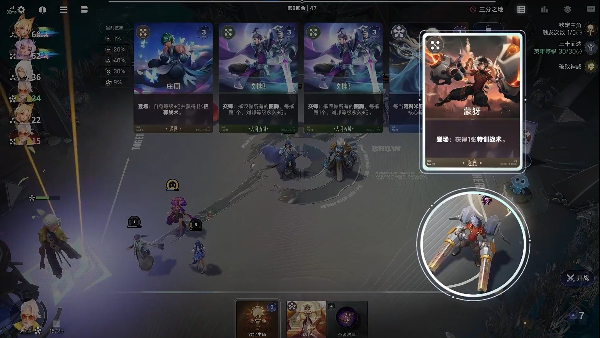 7、此階段重點尋找蒙犽,并將主要輸出裝備集中給他,通過持續(xù)使用戰(zhàn)術(shù)牌迅速拉高等級。