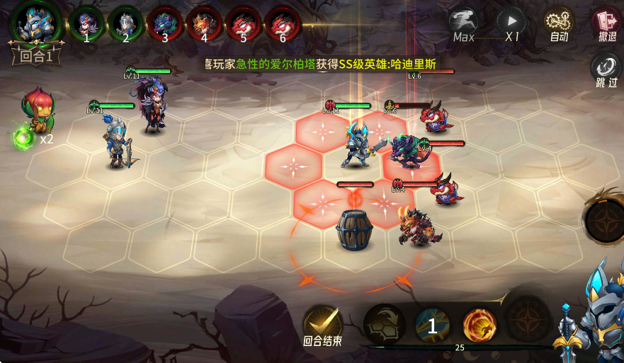 3、招募風格各異的英雄組成戰隊,通過六邊形戰棋布局搭配陣容,挑戰章節關卡、暗影之塔等玩法。