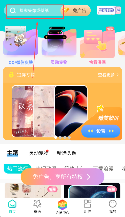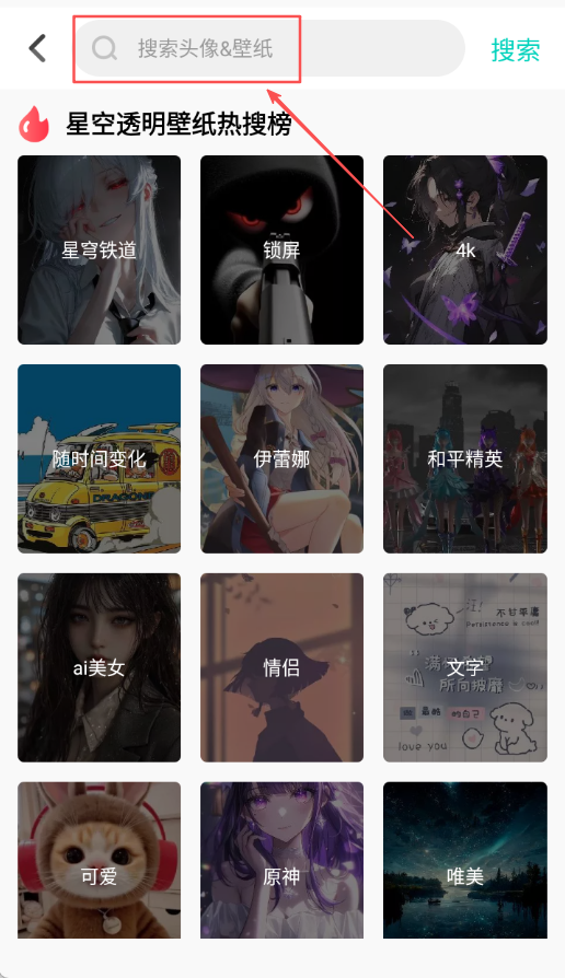 1、點擊頂部搜索欄進入搜索頁面在搜索頁面輸入關鍵詞,在搜索頁面輸入關鍵詞查找壁紙資源瀏覽相關結果列表展示。