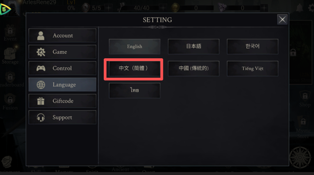 3、選好人物后,就進(jìn)入游戲了,這個(gè)時(shí)候我們點(diǎn)擊箭頭指的設(shè)置按鈕,進(jìn)入游戲設(shè)置頁(yè)面,在選擇language,然后進(jìn)去把語(yǔ)言修改成中文就ok了