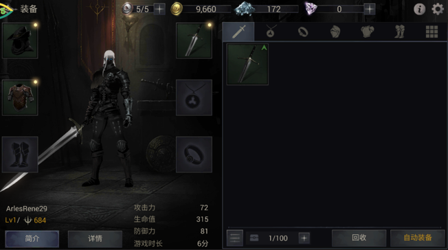 8、返回主頁(yè)面后,玩家可以在裝備頁(yè)面,查看自己獲得裝備,或者已經(jīng)穿戴的裝備;并對(duì)他們進(jìn)行升級(jí)或出售
