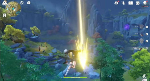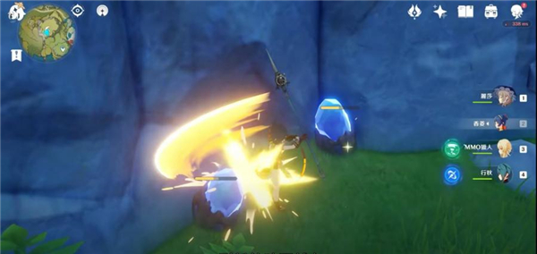 在挖稀有礦時,如果你的隊伍沒有大劍(雙手劍)角色,換角色又很麻煩,用單手劍或者長槍又要打很久,這時你可以利用下落攻擊,這樣通常2-3次就可以擊碎礦石,雖然《原神》不能在平地跳躍起直接下落攻擊,但是礦石通常都出現在靠邊的地方或者有斜度的地方所以一定有辦法使用下落攻擊。