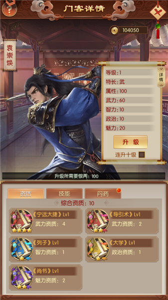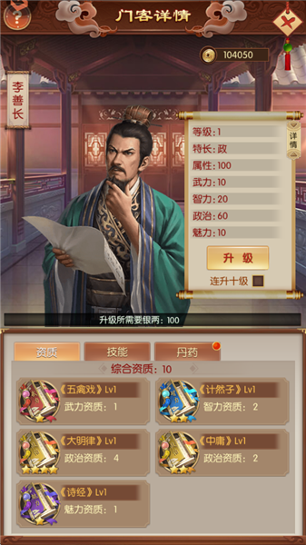 門客核心數值,等級越高,資質帶來的屬性加成越高,資質由武智政魅四類書籍提供。