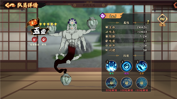必殺技:【拾之牙圓轉旋牙】獲得自身攻擊力140%的護盾。對自身周圍圓形范圍造成攻擊力300%傷害,然后對每個敵人有60%概率[嘲諷]。