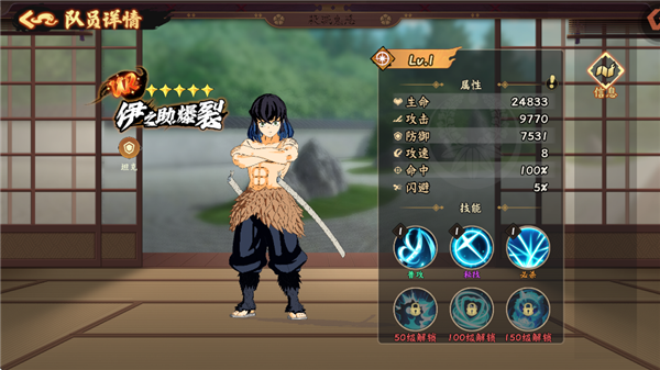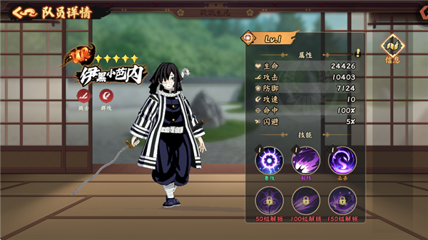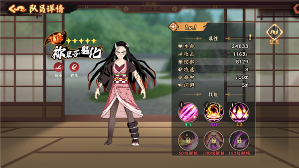 必殺技:【血鬼術八重帶斬】對前方大范圍造成攻擊力300%的傷害,擊飛目標,并有100%概率給予目標1層[流血]。
