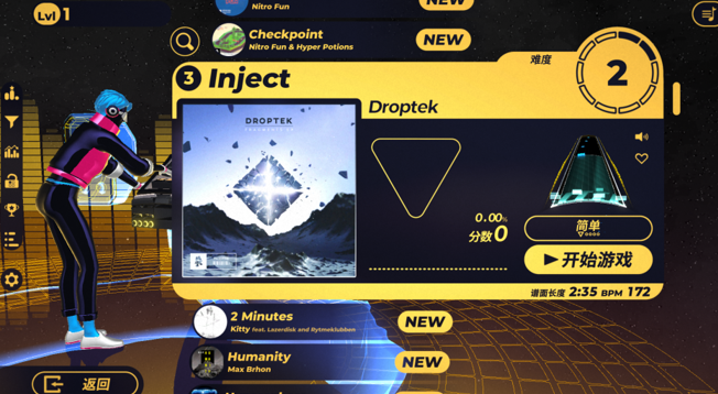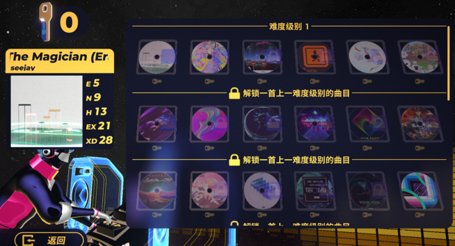 7、玩家可以自由選擇低難度的歌曲,更高難度的歌曲,需要玩家通關低難度歌曲后,進行解鎖。